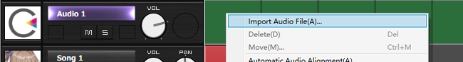 By selecting "Import" from the "File" menu or by right-clicking on an audio track and selecting "Import Audio File", an audio file can be loaded at the current position of the cursor.