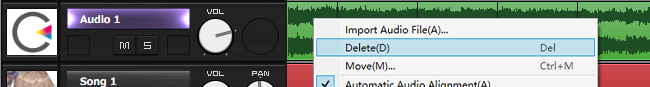 Select an audio element and press Del , or select "Delete" in the context menu to delete the element.
