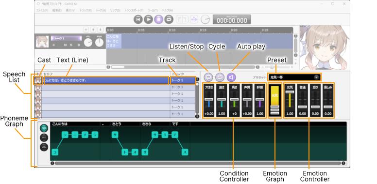 Enter text in the Speech List on the left, then adjust it in the condition and emotion controller on the right as well as in the phoneme graph.