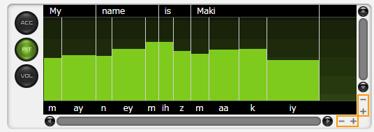 On the PIT and VOL screens, you can zoom in/out with the "+" and "-" buttons at the bottom right of the phoneme graph.