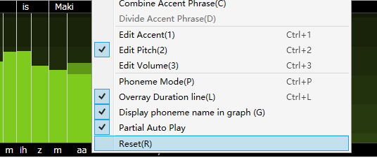 Selecting "Reset" from the right-click menu of the phoneme graph restores the accent, pitch, length and volume to the state before adjustment.