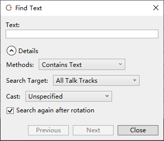The search window can be called up from the "Find Text" in the "Voice" menu, in the right-click menu of the Speech List or using the shortcut key Ctrl+F.
